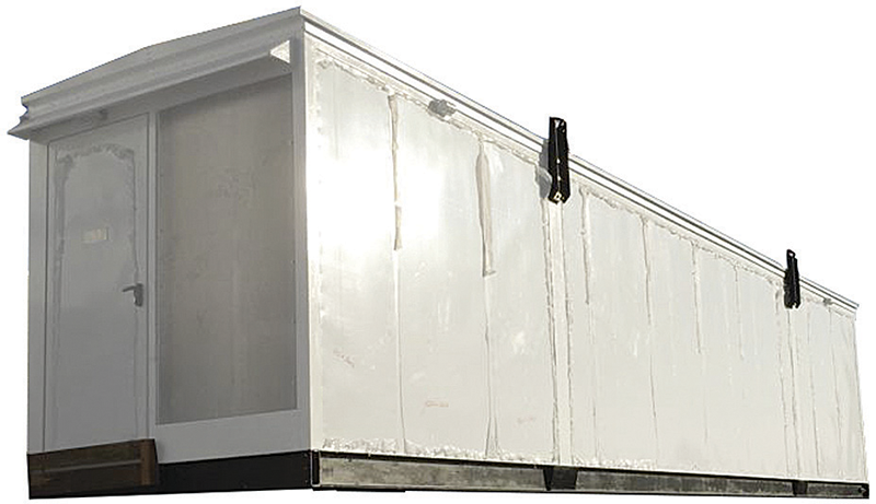 En este caso, la pared se conforma de varias placas. Sobre los pórticos se colocan chapas de acero galvanizado en frío pintadas de color RAL 7035 para proteger al esqueleto del shelter de igual forma que las paredes estándar.